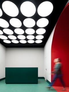 In the new office, we maintain continuity with the headquarters using the company’s identity. However, unlike the headquarters where four colors of the brand style are distributed across floors, here they are brought together to help zone the space. For example, a red arch marks the main entrance and serves as a portal, transporting one into a completely different world of childhood. Blue, green, and yellow cover the walls of the central volume because the “box” can be colored.